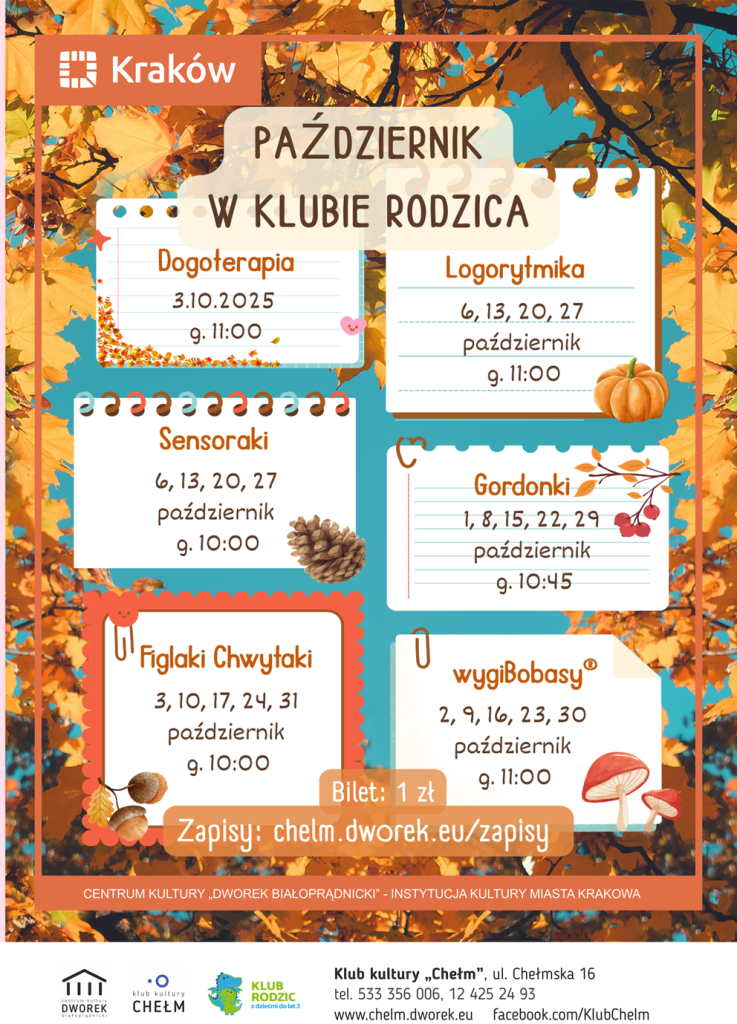 Pełny harmonogram, opis warsztatów i wszystkie niezbędne informacje znajdziecie na naszej stronie internetowej: https://chelm.dworek.eu/zajecia/klub-rodzica/