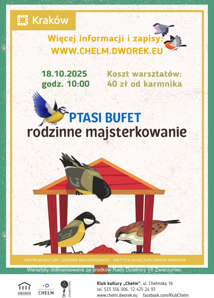 Warsztaty „Ptasi bufet” poprowadzi pan Piotr Mentel, który pochodzi z rodziny od pokoleń tworzącej drewniane zabawki stryszawskie. Inspiruje się naturą, a jego kolorowe ptaszki i kompozycje zachwycają na kiermaszach i targach sztuki ludowej.